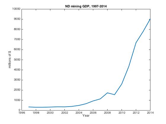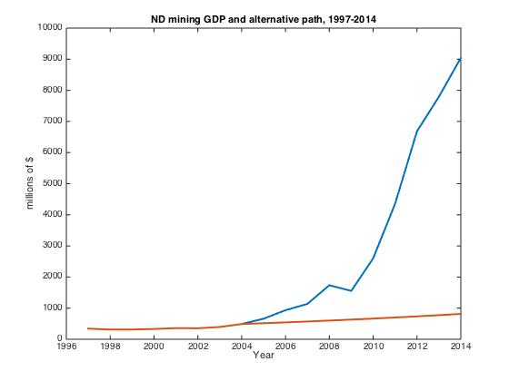 The boom is quite evident when you compare the two series here. When you remove the mining sector from North Dakota nominal GDP the annual growth rate drops to 6.6%. The annual growth with mining in the series is 7.6%. That is, we lose almost 1% of growth per year from no mining sector expansion. So how much does this total? If we look over the entire time period and subtract the low growth scenario from the actual series the total difference between the two is just short of $30 billion dollars (not discounted or inflation adjusted). That is more than the entire nominal GDP of North Dakota in 2007.